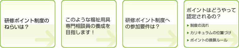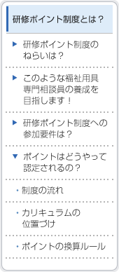 | ● | 福祉用具専門相談員がスキルを習得していく過程のうち、研修を受講した実績をポイントに換算して公表し、利用者や介護支援専門員等に、サービス選択の判断材料の一つとして活用していただきます。 |