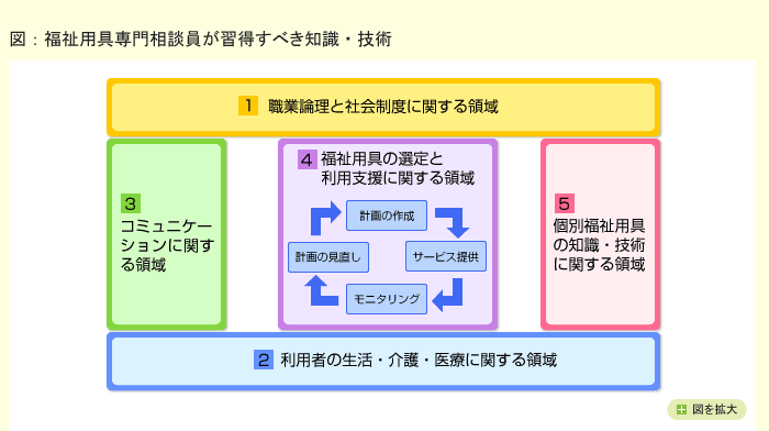 | ● | 福祉用具専門相談員に求められる知識・技術を、本制度における「カリキュラム」として表示しています。 | ||||